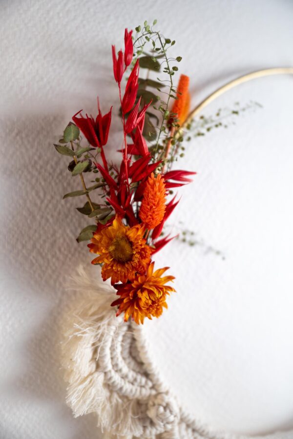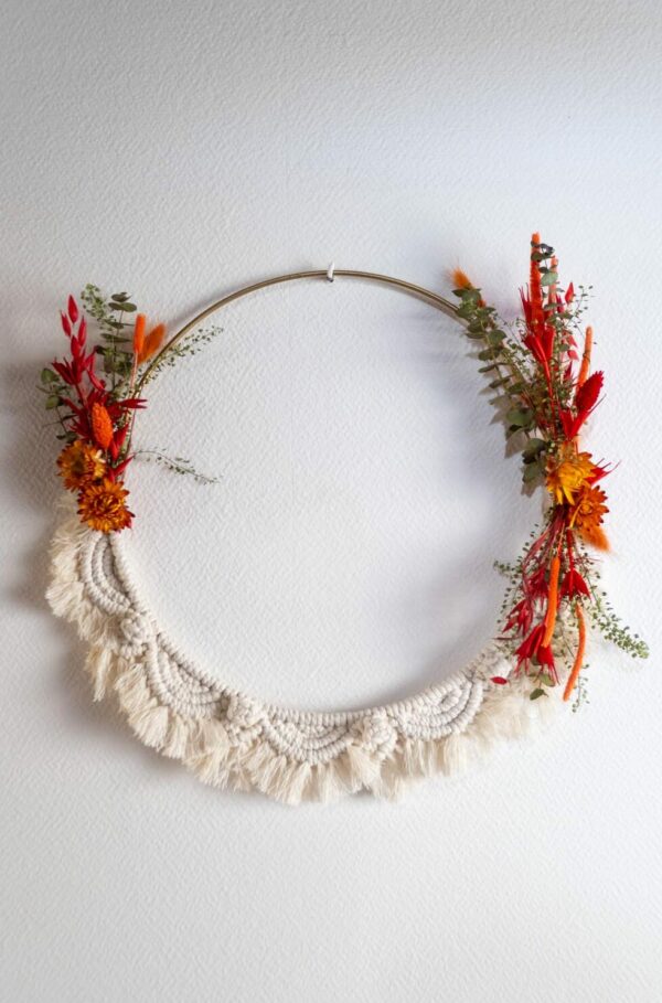 Ce cerceau macramé avec ces fleurs séchées sera une pièce maîtresse de votre déco. Accroché aux murs et aux portes, c’est un excellent moyen d’ajouter une touche bohème chic à votre espace. Il est fabriqué à l’aide d’un cerceau métal de couleur or, d’un cordon en coton macramé (réalisé par L’atelier sofie) et d’un assortiment de fleurs séchées confectionné par la Team Justine Fleurs. Veuillez noter que la taille du cerceau n’inclut pas la mesure supplémentaire de l’arrangement floral qui y est réalisé.